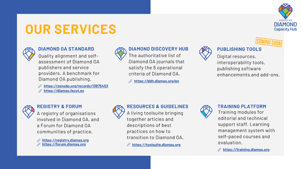 Rooryck, J., & Mounier, P. (2025, Oktober 29). The European Diamond Capacity Hub – Serving equitable Open Access publishing in Europe. Zenodo. https://doi.org/10.5281/zenodo.17472120